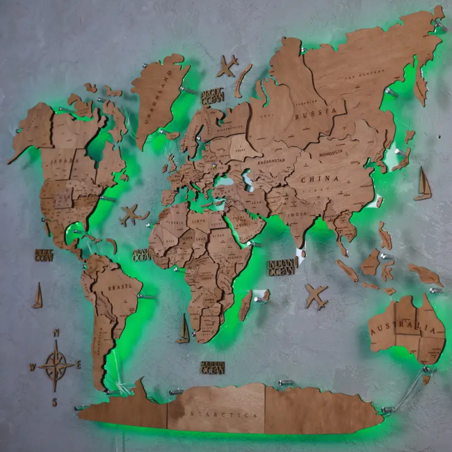 Для монтажу в кімнаті малюка найкраще підійде карта світу на стіну з підсвічуванням 3д. Розмістити виріб можна на робочому столі або біля спального місця. Карта світу для дітей на стіну викличе у малюка небувалий інтерес та підштовхне його до вивчення географії. Крім того, завдяки наявності підсвічування декор можна використовувати як нічник.