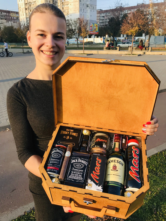 Attention! Увага! До Нового року залишилося біса мало часу! Як, ви ще не вибрали подарунок своєму чоловікові? А шефа на роботі? Теж ні? Треба терміново виправлятися. Стоп, нікуди бігти не треба! Придивіться до цієї дерев'яної диво-коробочці від CraftBoxUA, тут є все, щоб порадувати чоловіка і при цьому не перейти межу фамільярності (якщо одержувач – начальник): кращий елітний віскі Jack daniel's і Jameson і смачне молоко Mars.