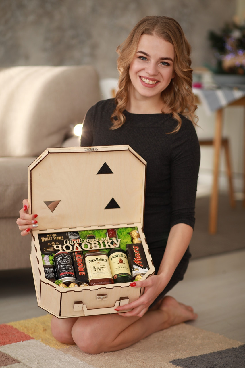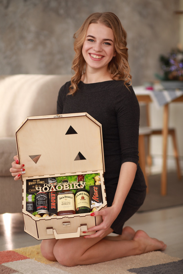 Хлопці приготували набори, які оцінюватимуть всі чоловіки! У дерев'яному боксі оригінальної форми дві пляшки гарного віскі – Jameson та Jack daniel's Honey великого літражу. Додатково до них йдуть спеціальні каміння для віскі, міні-версія «Джека», смачні конфети та молоко Mars.